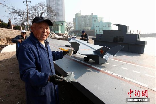 温玉柱老人在为自造的“航母”进行最后的修饰,并把“舰载机”搬上了甲板进行“试机”。