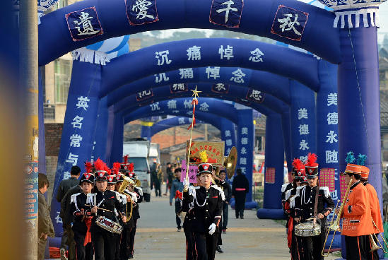 福建省长乐市一送葬队伍走出家门口。这支送葬队伍长达2公里多,据村民介绍,这场丧事花费至少上百万元(4月5日摄)。近年来,福建省沿海一些地方丧事大操大办现象愈演愈烈,炫富攀比现象严重,一些富裕家庭丧事规模越来越大、档次越来越高。新华社记者 张国俊 摄