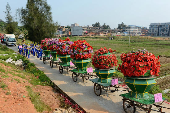 福建省长乐市一送葬队伍中的花车队行走在村道上。