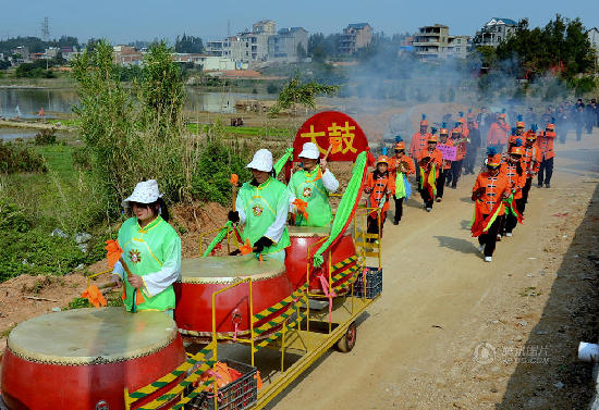 福建省长乐市一送葬队伍中的鼓乐队行走在村道上。