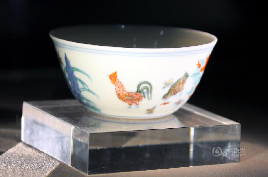 4月8日,香港苏富比2014年春季拍卖会压轴大戏--重要中国瓷器及工艺品春季拍卖会在香港会展中心上演。玫茵堂珍藏明成化斗彩鸡缸杯以2.8124亿港币的成交价被中国上海一位收藏家夺得,刷新中国瓷器世界拍卖纪录。这是香港苏富比2014年春拍预展上展出的玫茵堂珍藏明成化斗彩鸡缸碗。新华社记者李鹏摄