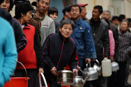 4月11日,在兰州市西固区一居民区,居民们排队打水。当日,兰州市自来水苯含量超标事件发生后,当地发生污染事故的水厂自流沟进口已被紧急关停。为保障市民用水,当地政府启动应急预案,积极调配安全水源,由消防、环卫等部门采取定点、定时的方式向居民免费送水。新华社记者 陈斌 摄