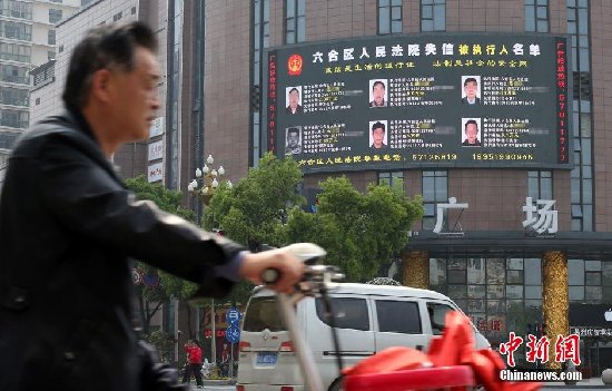 4月14日,街头的大屏幕滚动播放着“老赖”相关信息。中新社发 泱波 摄