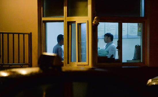 4月13日零时27分,工作人员(左)将前来弃婴的一名男子带入南京福利院大门的值班室,进行劝导。虽然有南京儿童福利院专门安排负责劝阻弃婴行为的工作人员,还有当地派出所安排的数名巡夜保安,但是记者在3夜的蹲守期间,仍目击了6例弃婴行为,其中4例被劝阻,另外两例因弃婴者迅速跑离现场、无法追寻而被南京儿童福利院收留。新华社记者 沈鹏摄
