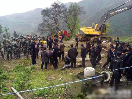 村民称,县政府强行挖两百多年的古树,村民不同意,县里出动民兵和警察强行伐树,与村民发生冲突。