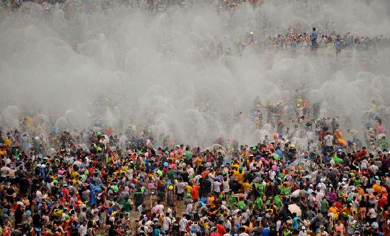 4月15日,数万名当地群众和游客在云南省西双版纳州景洪市泼水广场上泼水狂欢。当日是2014年西双版纳泼水节,也是傣历1376年新年节系列活动的最后一天,数万名当地群众穿上节日盛装,和外地游客一起在云南省西双版纳傣族自治州景洪市互相泼水,互祝吉祥、幸福、健康。泼水节是傣族人民送旧迎新的传统节日,已有上千年历史。新华社记者 蔺以光 摄