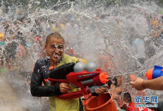 4月15日,人们在云南省西双版纳州景洪市泼水广场上泼水狂欢。新华社记者 蔺以光 摄