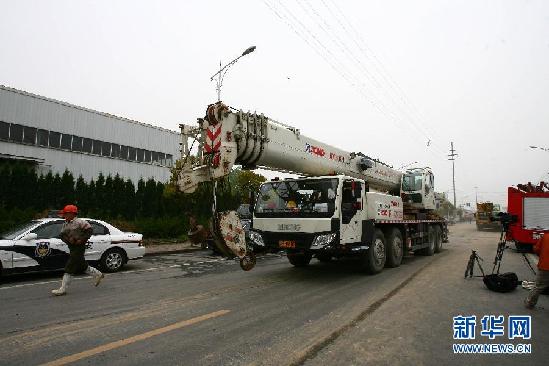 4月16日,一辆大型吊车赶到江苏如皋一化工厂爆炸现场参与救援。新华社发(江建华 摄)