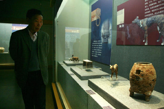 2014年4月16日,流星王朝的遗辉—隋炀帝墓出土文物特展在扬州博物馆一楼特展厅开展,展期三个月。这是“2013年度全国十大考古新发现”之一的隋炀帝墓出土文物首次公开亮相,展出隋炀帝墓及萧后墓出土文物百余件。图为参观者观赏陶狗、陶仓。
