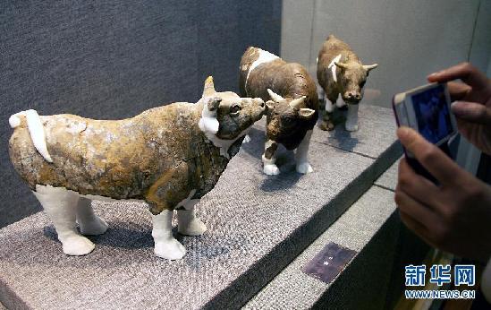 4月16日,一名参观者在扬州博物馆的隋炀帝墓出土文物特展上欣赏“陶牛”。