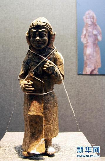 4月16日在扬州博物馆的隋炀帝墓出土文物特展上拍摄的“彩绘执盾武士俑”。