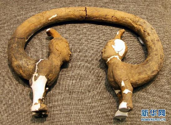 2014年4月16日,以“流星王朝的遗辉”为主题的隋炀帝墓出土文物特展,在扬州双博馆展出。图为展品双人首蛇身俑。