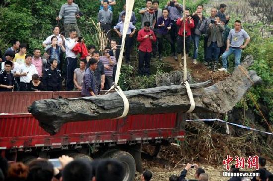 “纵有黄金满箱,不如乌木一方”。4月16日下午13时左右,江西省武宁县船滩镇船滩河杨岩石段河床周围人山人海,鞭炮齐鸣。备受武宁县人民关注的船滩河乌木正式开挖。在一台大挖掘机和两台小挖掘机的工作下,经过大约三个小时不间断开挖,江西省武宁县船滩镇船滩河杨岩石段河床里沉睡了4000年的乌木终于露出“真容”。据悉,乌木将“安家”在武宁县博物馆内。