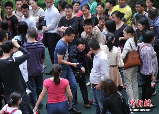 针对家长反映的问题,幼儿园管辖地的重庆北部新区新闻发言人表示,该区高度重视此次事件。经初步调查决定,该幼儿园将承担全部责任,并由该园对全园幼儿开展免费健康检查,做好后续健康观察及相关处理,根据食药监分局调查和检测结果,将依法依规严肃处理责任方。图为一家长在幼儿园内讨说法时哭泣。陈超 摄