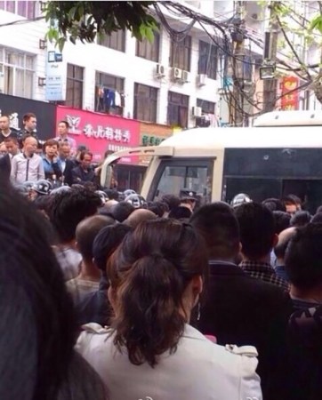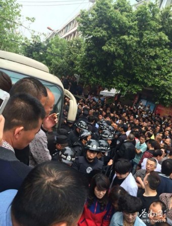 4月19日上午,网曝温州苍南县灵溪镇城管打人至吐血,现在医院抢救,现场近千群众围困打人者。