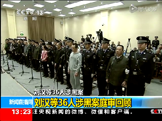 图为:刘汉等10人案庭审现场,刘汉多次落泪。