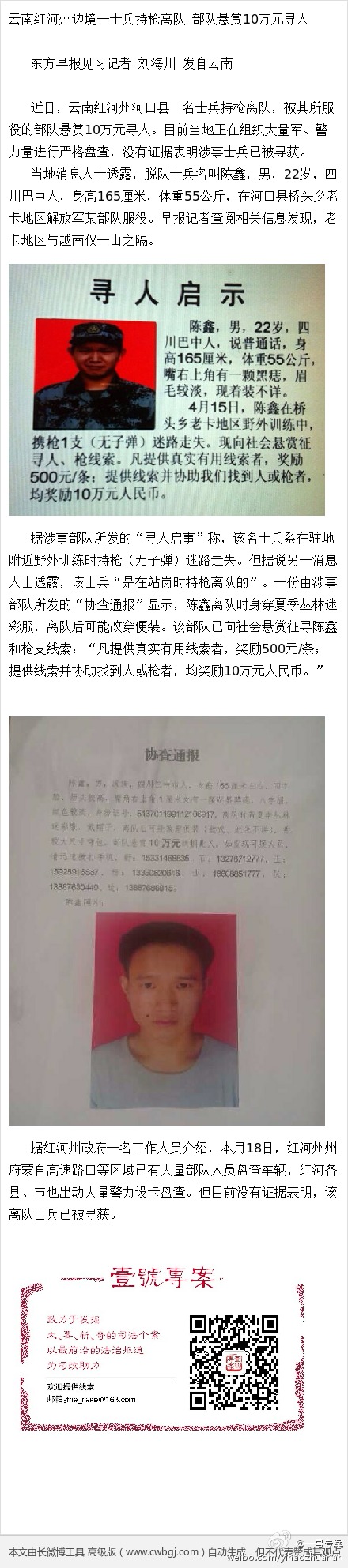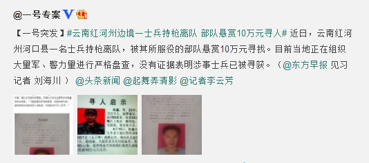 【一号突发】#云南红河州边境一士兵持枪离队 部队悬赏10万元寻人# 近日,云南红河州河口县一名士兵持枪离队,被其所服役的部队悬赏10万元寻找。目前当地正在组织大量军、警力量进行严格盘查,没有证据表明涉事士兵已被寻获。(@东方早报 见习记者 刘海川 )