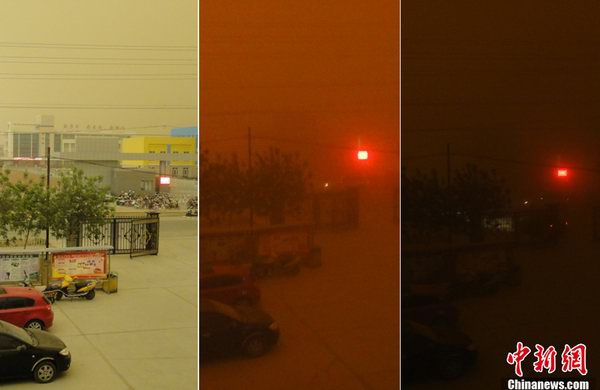 4月23日,新疆尉犁县遭遇强沙尘暴。据尉犁县气象局消息,当日9点30分该县风力已达8级;12时县域内能见度几乎为零,昏天黑地,白天瞬间变黑夜。受沙尘暴影响,该县路灯、学校、小区、商铺等停电;客运站班线车、出租车被迫暂停运营,交警大队出动全体警力,在县城、农村重点路段设立执勤点对过往车辆进行指挥疏导;棉花、设施大棚均受其影响。李飞 摄