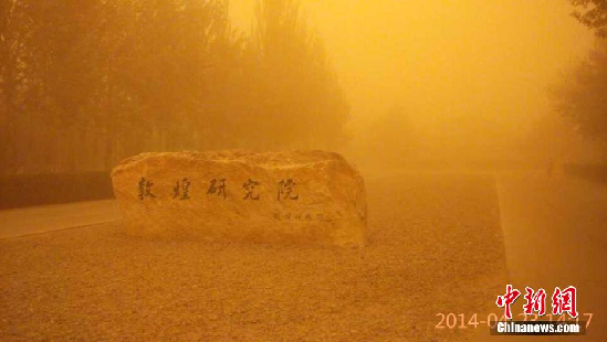 4月23日14时许,敦煌遭能见度不足50米的特强沙尘暴突袭,这座戈壁城市“四周瞬时一片漆黑”。钟欣 摄