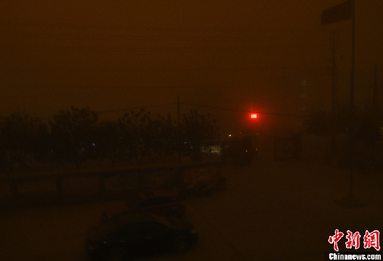 4月23日,新疆尉犁县遭遇强沙尘暴。据尉犁县气象局消息,当日9点30分该县风力已达8级;12时县域内能见度几乎为零,昏天黑地,白天瞬间变黑夜。受沙尘暴影响,该县路灯、学校、小区、商铺等停电;客运站班线车、出租车被迫暂停运营,交警大队出动全体警力,在县城、农村重点路段设立执勤点对过往车辆进行指挥疏导;棉花、设施大棚均受其影响。李飞 摄