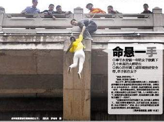 “快去看,有人要跳桥了!”周围人的喊声让成华清心里一惊。他跑上前两步,绕过了餐馆门口的柱子,终于看清了桥上的情景:一位穿着黄色上衣的女子,正悬在大桥外缘。
