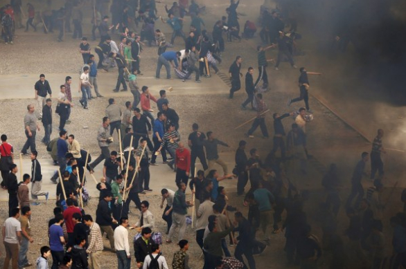 4月25日上午9时,北京市公安局在房山区举行处置对抗性强的群体性事件演练活动,现场近百名模仿"非法聚集群众"的演员手持棍棒与警方对抗。