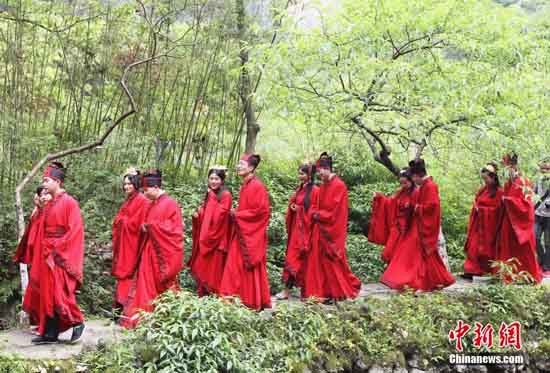 5月2日,首届传统汉服集体婚典在重庆酉阳桃花源举行,52对新人伴悠远古琴乐声,着中华传统汉服、行周礼,在世人向往的“世外桃源”许下幸福盟约。中新社发 周毅 摄