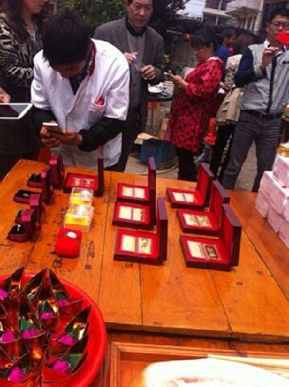 “台州路桥又现土豪娶媳妇,288万现金、十几根金条、数枚钻戒……”近日,在台州市一本地论坛上,接连有网友晒土豪娶媳妇。图片中,红色的百元人民币被扎成一捆一捆,和黄色的金条、亮眼的钻戒等一起被摆放在桌上,供亲友惊叹。
