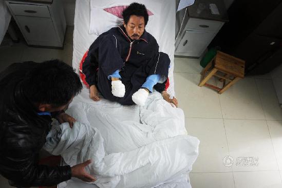 2014年5月11日,安徽省定远县,残缺的肢体时常会发出刺骨的疼痛,刘敦和只能蜷缩着双腿痛苦不堪。今年1月份,安徽定远县严桥乡44岁的刘敦和生病了,先是双脚起水泡,接着浮肿、发黑发臭。然而,他家里没钱,新农合也未办理,就一直没到医院检查治疗。前不久前,他实在无法忍受疼痛,用摔碎的茶杯碎片将自己双脚割掉。浅川 摄