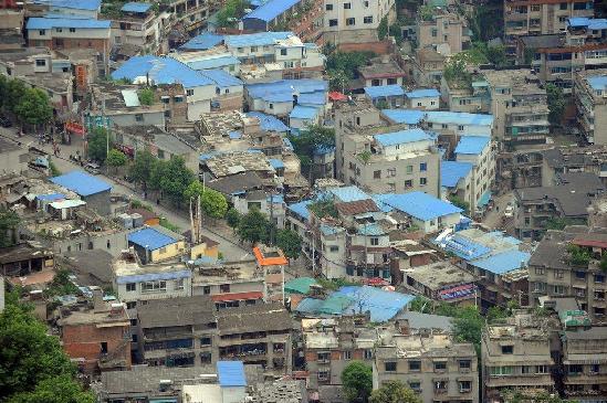 2014年5月14日,贵阳市云岩区东面许多楼房最近都被加了“铁皮帽子”。这些密集的楼房中,大多数是七八层楼,看不出规划与秩序,这些密密麻麻的楼房最高一层用板房的铁皮盖着,从高处望去成了城市上空的棚户区。呈文 摄 图片来源:CFP视觉中国