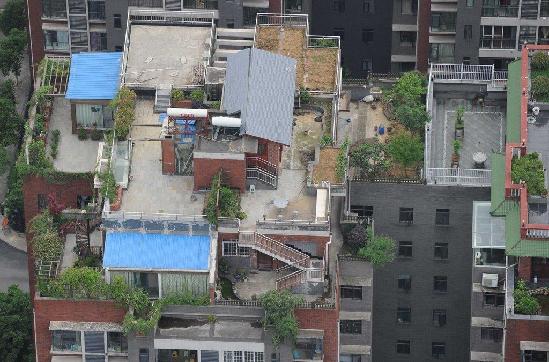 2014年5月14日,贵阳市云岩区东面许多楼房最近都被加了“铁皮帽子”。这些密集的楼房中,大多数是七八层楼,看不出规划与秩序,这些密密麻麻的楼房最高一层用板房的铁皮盖着,从高处望去成了城市上空的棚户区。呈文 摄 图片来源:CFP视觉中国