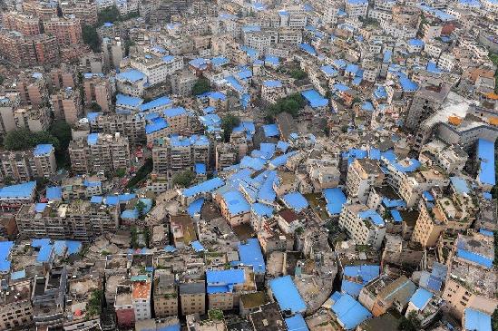 2014年5月14日,贵阳市云岩区东面许多楼房最近都被加了“铁皮帽子”。这些密集的楼房中,大多数是七八层楼,看不出规划与秩序,这些密密麻麻的楼房最高一层用板房的铁皮盖着,从高处望去成了城市上空的棚户区。呈文 摄 图片来源:CFP视觉中国