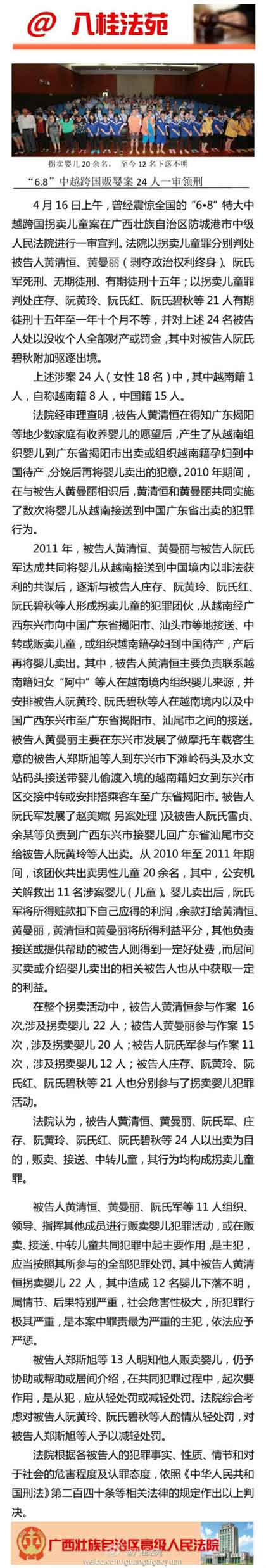 人民网北京5月16日电 据中央电视台新闻中心官方微博消息,今天,“6.8”特大跨国拐卖儿童案在广西防城港中院宣判。24名被告因拐卖儿童罪获刑,其中黄清恒、黄曼丽、阮氏军3名主犯被分别判处死刑、无期徒刑、有期徒刑15年。另外21名被告分别判处1年10个月至15年。该团伙2010年以来从越南将20多名婴儿拐卖到广东。