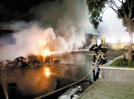 5月18日凌晨1点11分,重庆北碚区滨江路泰吉滨江段,一辆法拉利跑车与出租车相撞后起火燃烧,北碚区公安分局相关工作人员表示,车祸共造成1死3伤,其中法拉利司机严重烧伤,坐副驾驶的乘客死亡,法拉利已被烧成空架子,事故原因正在进一步调查中。图为消防员扑灭起火的法拉利。重庆晨报 通讯员 孙华建 摄