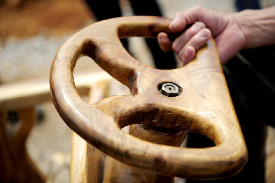 三轮车的方向盘也是樟木做的。车子上配上前进后开关,有油门、刹车,有前灯后灯左右转向灯,甚至连车载音箱都配有。