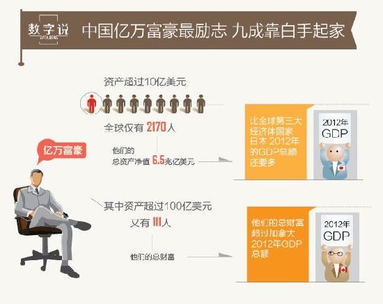 【中国亿万富豪六成白手起家】中国亿万富豪白手起家比例全球最高,主要原因是因为改革开放政策提出后,才允许私有制的产生。而亿万富豪也随运而生。尽管高达60%的白手起家率,富二代却在中国风评较差。另一方面,中国亿万的主要收入来源为房地产,这也是大家对其诟病的一个理由。