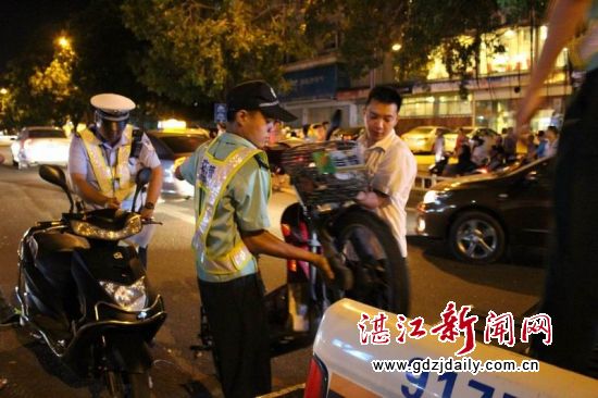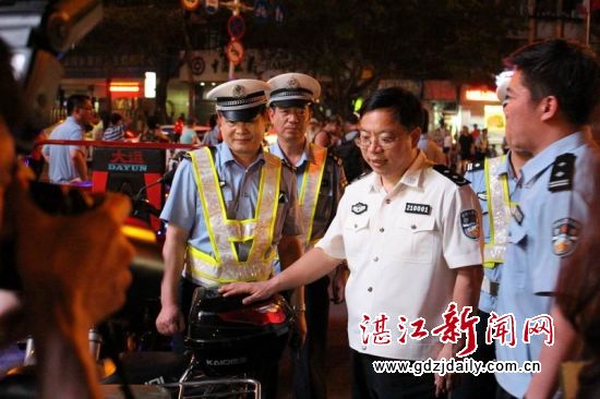 湛江新闻网讯:5月21日晚,根据市公安局的部署,交警支队霞山大队积极组织全体民警参加“千警上路整治交通”统一执法大行动,当晚大队共出动警力250人次,警车170辆次,查扣车辆240辆,其中二轮摩托车109辆,电动车121辆,三轮摩托车10辆,行政拘留无证驾驶人员12人。在行动中,市政府常务副市长、公安局长、市区交通秩序综合整治专项行动副总指挥张荣辉、市局党委副书记、副局长梁瑞国等领导实地督导各路口的统一执法行动,在交通整治现场巡查并指导交通执法工作。交警支队支队长吴小明也到达岗点指导交通整治工作、参加整治行动,与执勤民警一起在人民西五路王府井百货路段查纠违法行为。