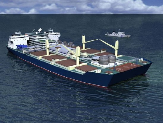 岛礁施工平台效果图,中国执法船在一侧警戒。(中船第九设计研究院)