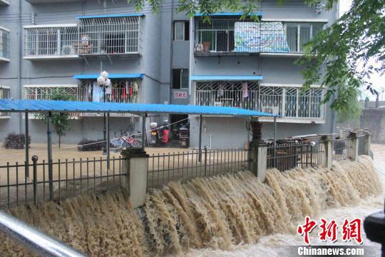 贵州省铜仁市江口县因强降雨,致道路溢水中断,商铺、民房被淹受损。图为地势低洼处四溢的洪水犹如河坝泄洪。 田维虎 摄