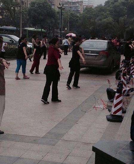 由于接到业主关于“广场舞扰民”的投诉,武汉一小区物业公司在门口广场上拉起了百余米长的铁丝网,以阻止跳广场舞。但仅过了两天,舞迷们剪断并挪走了铁丝网,再次“占领”广场。图为舞群还在翩翩起舞,丝毫不顾近在咫尺的“路障。