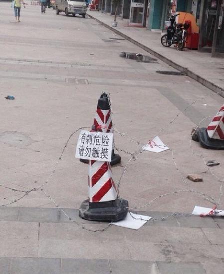 原本摆放在广场上的标识桩已经被挪开,铁丝网也被剪断。