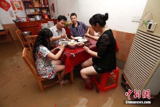 湖南多地遭暴雨袭击 民众水中用餐