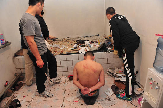 犯罪嫌疑人被制服,便衣正在抽查房间。