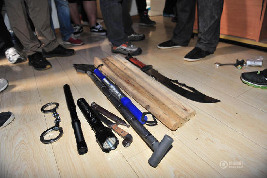 在犯罪嫌疑人家中查获大量管制刀具手铐。