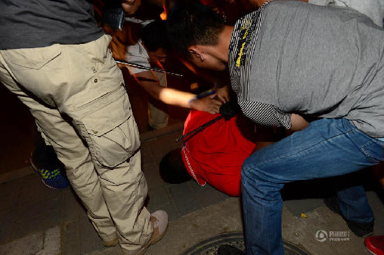 外籍毒贩多以学生或难民为由获得中国签证,进入中国后就不再去上学或工作,而是与其他老乡进行贩毒活动。当毒贩被抓获遣送回国后,部分毒贩更换身份后仍会以同样理由获取中国签证,随后再返回中国贩毒。图为5月24日凌晨,贩毒分子从出租车下车欲逃跑被制服。