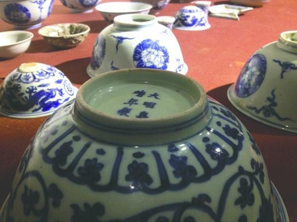 成都商报记者在广汉三星堆博物馆看到了这批瓷器,发现除了5件白瓷碟外,每件瓷器上都有青色花纹,或是山水、或是人物、或是花朵,无不栩栩如生。一只大青花瓷碗表面印有漂亮的藤蔓花卉,碗底上的“大明嘉靖年制”6个大字表明了其久远的年代。此外,部分瓷器上还印有“富贵佳器”等文字。
