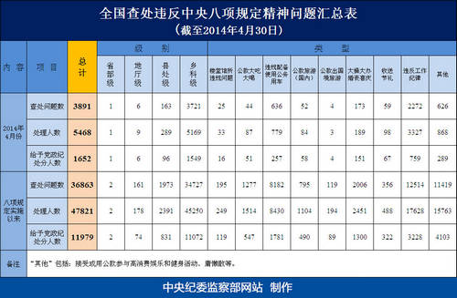 2014年4月全国查处违反中央八项规定精神问题汇总表