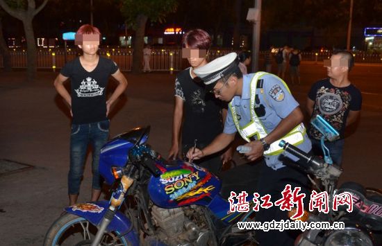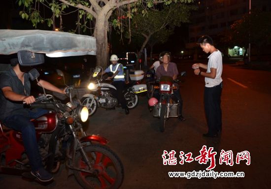湛江新闻网讯:经过四个多月的市区交通秩序综合整治,赤坎辖区交通违法行为得到有效的治理,交通秩序已明显好转,白天辖区的交通违法行为已经得到有效的遏制,也从中发现,因白天查处交通违法力度大,不少违法摩托车白天不敢上路,多是选择晚上,尤其是晚上22时以后在辖区内进行非法营运、街头聚集、飙车,其中也有“双抢”违法人员,给道路交通管理、社会治安带来负面影响和安全隐患。