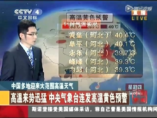 据中央气象台网站消息,中央气象台今早6时继续发布高温黄色预警:预计今天白天,河北中南部、北京、天津、黄淮大部、江淮中部、山西中部及南部、新疆南疆盆地及吐鲁番盆地、云南中部、海南岛北部等地有35℃以上的高温天气;其中,北京中南部、天津中西部、河北中南部、河南北部、山东西部、吐鲁番盆地等地的部分地区最高气温可达37~39℃,局地可达40℃。