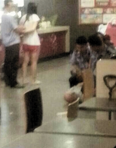 一女嫌疑人(左二)和光头男子被控制。5月28日,在招远市一快餐店内,6人与一女受害者发生口角后将对方打死。视频截图